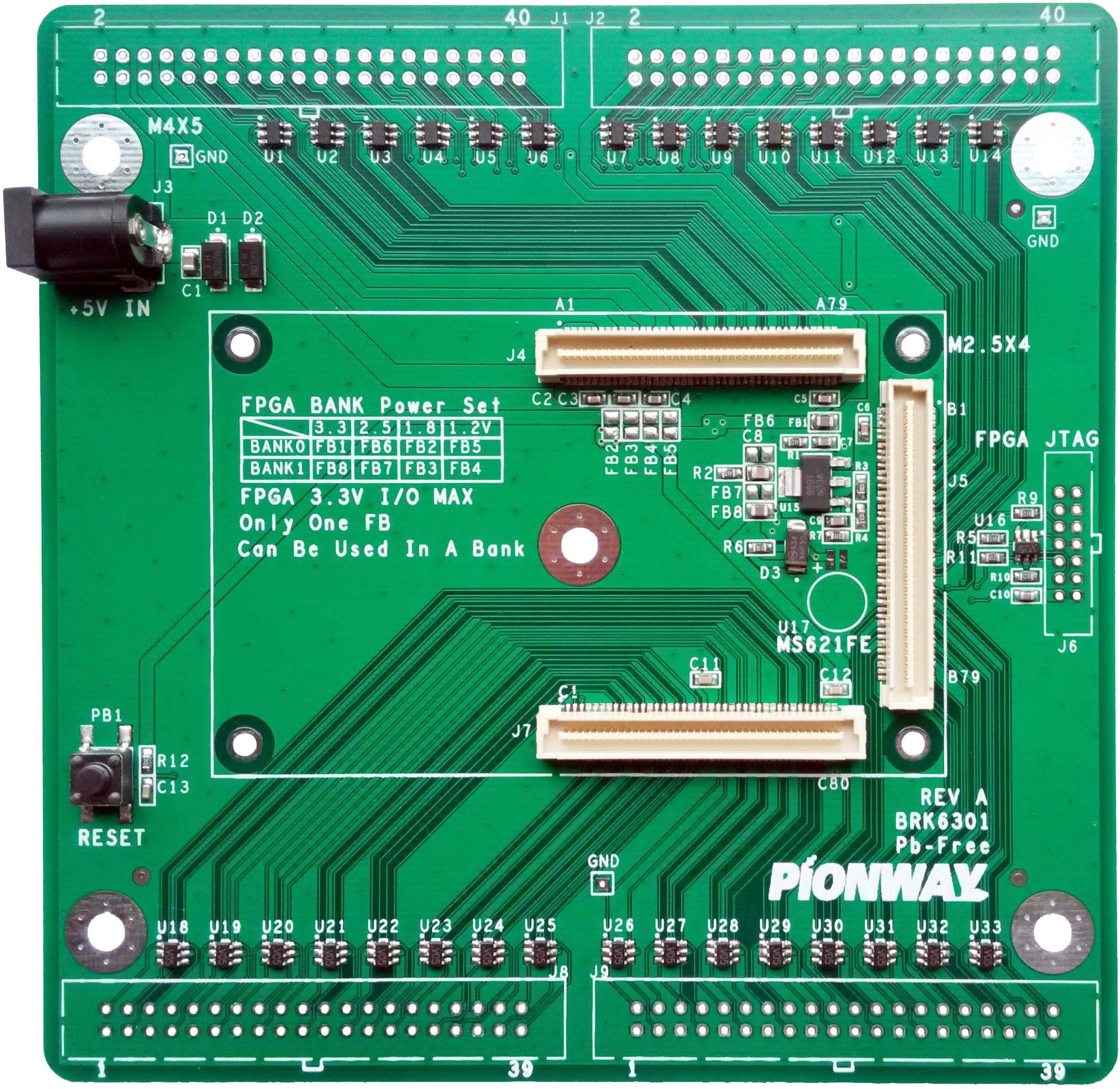 将XMS6301上的三个高密度板对板连接器上的电源及信号I/O引出至这四个连接器上,为XMS6301提供了一种简单的连接。